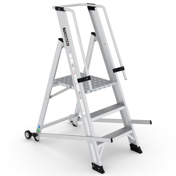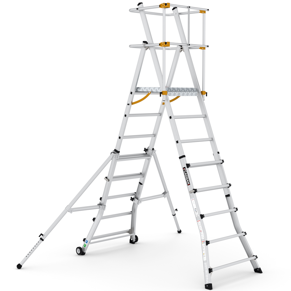 TELEPRO – Teleskopik Platformlu Merdivenler, kullanıcıların platform yüksekliğini teleskopik şekilde ayarlayabilmesine olanak tanır. İki ayak kısmı da teleskopik olarak ayarlanabilir, böylece kademeli zeminlerde bile kullanılabilir. TELEPRO, uzayabilen ve kilitlenebilir denge ayaklarıyla daha güvenli bir çalışma alanı sunar. Alüminyum platform, kaymaz desenli ve tekmelikli olarak tasarlanmıştır, bu sayede uzun süre güvenle çalışabilirsiniz. Arka kısımdaki büyük tekerlekler sayesinde ürünü kaldırmadan taşıyabilir ve istediğiniz yere götürebilirsiniz.